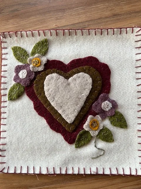 Create a cozy three stacked heart with wool felt and hand stitching. All supplies provided!
