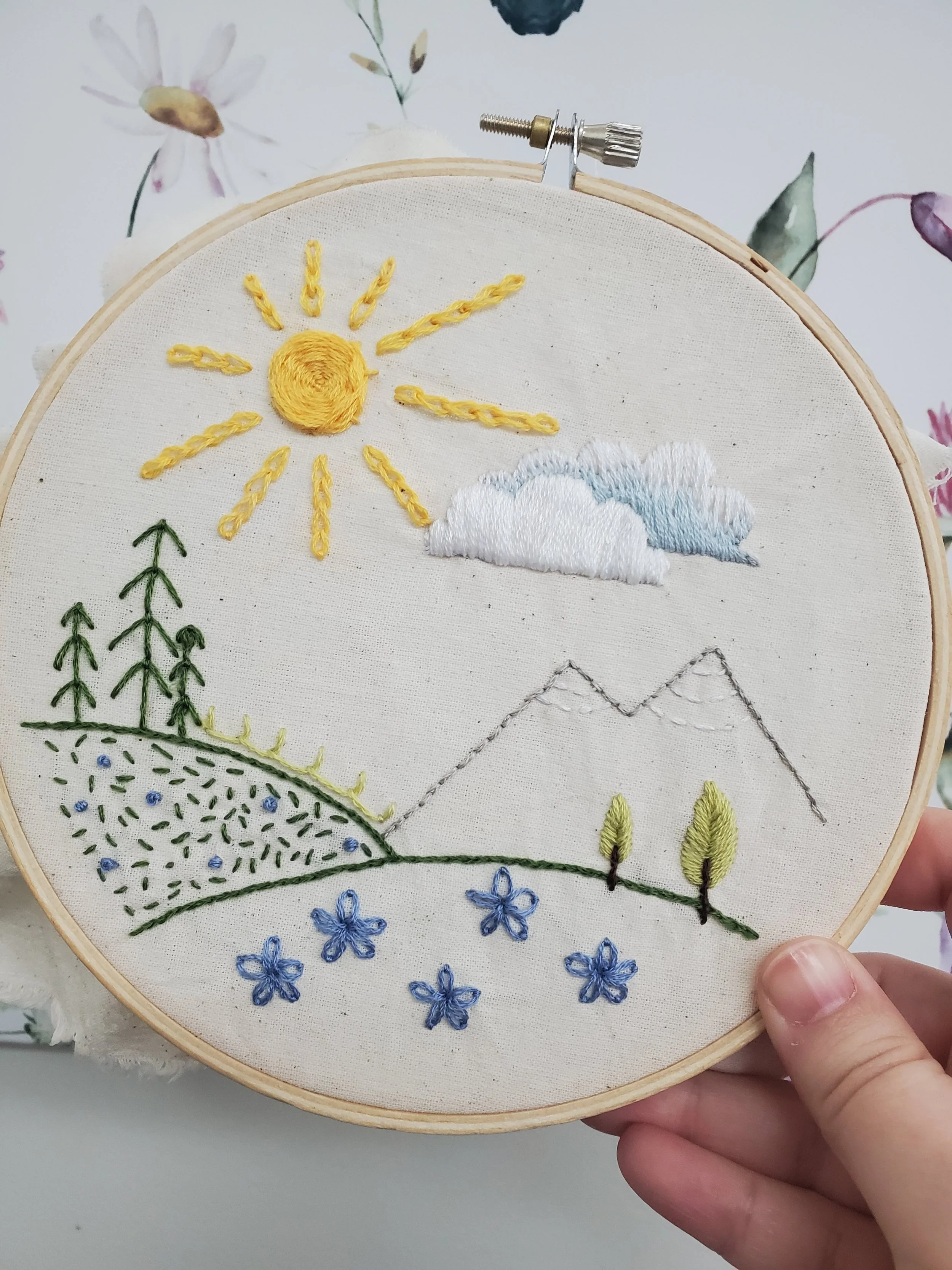 Learn basic embroidery techniques by making a sampler! Follow along to create a landscape using multiple stitches that you learn along the way.